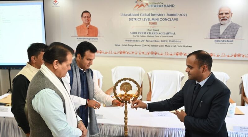 उत्तराखण्ड वैश्विक निवेशक सम्मेलन- 2023 के तहत बुधवार को जिला स्तरीय मिनी कॉन्क्लेव का विधिवत् दीप प्रज्जवलित कर शुभारंभ किया गया। इस मौके पर कैनिनेट मंत्री/जनपद प्रभारी मंत्री प्रेम चंद अग्रवाल द्वारा मुख्य अतिथि के रूप में प्रतिभाग किया गया।