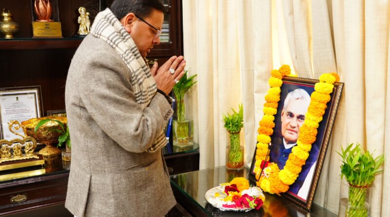 मुख्यमंत्री श्री पुष्कर सिंह ने पूर्व प्रधानमंत्री, भारत रत्न अटल बिहारी वाजपेयी की जयंती पर मुख्यमंत्री कैंप कार्यालय में उनके चित्र पर श्रद्धासुमन अर्पित करते हुए उनको नमन किया।