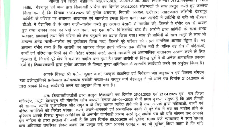 देहरादून दिनांक 26 अपै्रल 2026 (सूवि) शहर के सहस्त्रधारा रोड स्थित एटीएस कालोनी में बिल्डर की गूंडागर्दी पर जिला मजिस्टेªट कोर्ट ने संज्ञान लेते हुए गुंडा एक्ट में नोटिस जारी करते हुए 07 दिन के भीतर प्रतिउत्तर प्रस्तुत करने के निर्देश दिए हैं प्रतिउत्तर प्राप्त न होने के की दशा में जिला बदर की कार्यवाही शुरू कर दी जाएगी। इससे पूर्व भी विवादित बिल्डर पर दीपावली में नाबालिग बच्चों पर पिस्टल लहराने तथा लाईसेंसी शस्त्र को प्रदर्शित करने पर डीएम ने शस्त्र लाईसेंसधारक पुनीत अग्रवाल की लापरवाही मानते हुए उनका शस्त्र जब्त करते हुए शस्त्र लाईसेंस निलम्बित कर दिया था। आरोपी बिल्डर पर डीआरडीओं वैज्ञानिक के साथ मारपीट एवं उत्पीड़न, नशे में धुत होकर एटीएस आरडब्ल्यूए अध्यक्ष के साथ मारपीट, बच्चों से गाली गलौच, दीपावली पर पिस्टल तानने, बच्चों से गाली गलौच एवं गाड़ी से टक्कर मारने का प्रयास, जनरल बाडी मीटिंग में धमकाने अभद्र भाषा का प्रयोग, आरोपी द्वारा निवासियों एवं आरडब्ल्यूए के सदस्यों को जानबूझकर झूठे मुकदमों एवं निराधार आरोपों में फंसाकर उत्पीड़न करने का प्रयास, विधवा महिला की भूमि को कूट रचित रजिस्ट्री एवं अनाधिकृत कब्जा मामलों विभिन्न धाराओं में 05 एफआईआर दर्ज हैं।