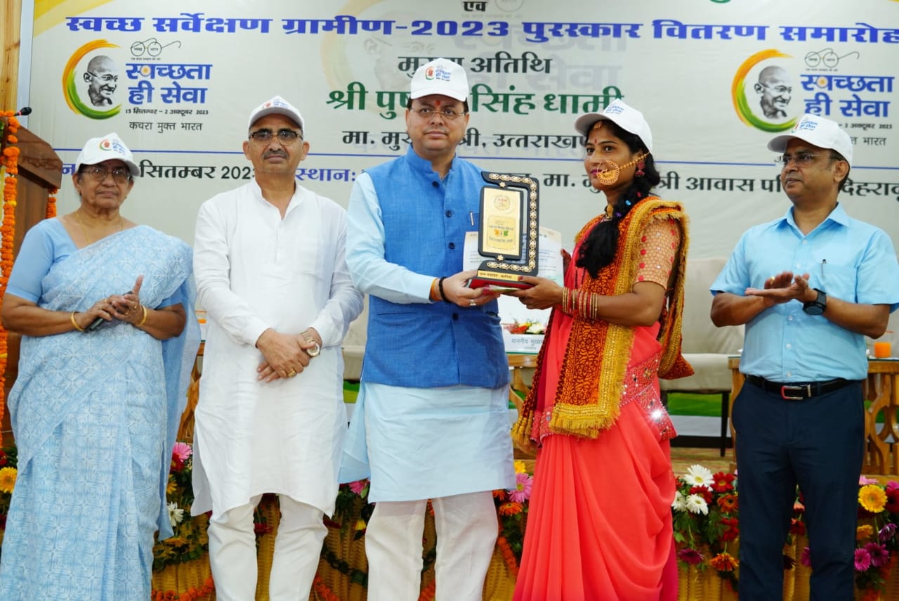 मुख्यमंत्री श्री पुष्कर सिंह धामी ने सोमवार को मुख्यमंत्री आवास स्थित मुख्य सेवक सदन में स्वच्छता सेवा पखवाड़ा-2023 का शुभारंभ किया। कार्यक्रम में ‘स्वच्छ सर्वेक्षण ग्रामीण-2023’ से मुख्यमंत्री ने 15 ग्राम पचायतों को सम्मानित किया। मुख्यमंत्री ने इस अवसर पर स्वच्छता के क्षेत्र में सराहनीय कार्य करने वाले 05 पर्यावरण मित्रों को भी सम्मानित किया। ‘स्वच्छता ही सेवा गीत’ का भी इस अवसर पर मुख्यमंत्री ने विमोचन किया।